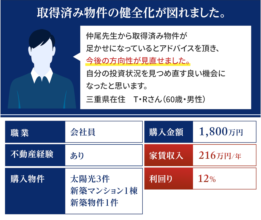 業界歴14年・賃貸経営歴17年を誇る不動産投資のプロが、あなたの資金状況やビジョンをヒアリングし、今後の方針を丁寧にアドバイスします。